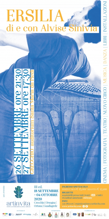 settembre alle 17.30, porterà in scena la nuova performance del giovanissimo artista classe 1987 che vanta già una partecipazione alla Biennale di Venezia e moltissime performance in tutta Europa: Ersilia. Ersilia è il nome che Sinivia ha dato al suo strumento, decisamente unico nel suo genere, nato dalla scomposizione e ricomposizione in una nuova forma e in un nuovo suono di cinque pianoforti ormai in disuso che senza la sua creatività non avrebbero più regalato alcuna nota al pubblico e che invece rinascono in una nuova forma e una nuova moderna melodia. Uno strumento "vivo" che rimarrà a disposizione del pubblico fino al termine del Festival Artinvita per provare, con le proprie mani, l'ebbrezza dell'espressività e la creatività . Inoltre Alvise resterà a Crecchio il 28 settembre per un incontro formativo con i giovani musicisti del territorio che vorranno partecipare alla sua Masterclass prenotabile scrivendo all'indirizzo direzione@artinvita.com.