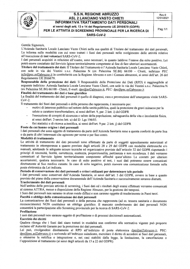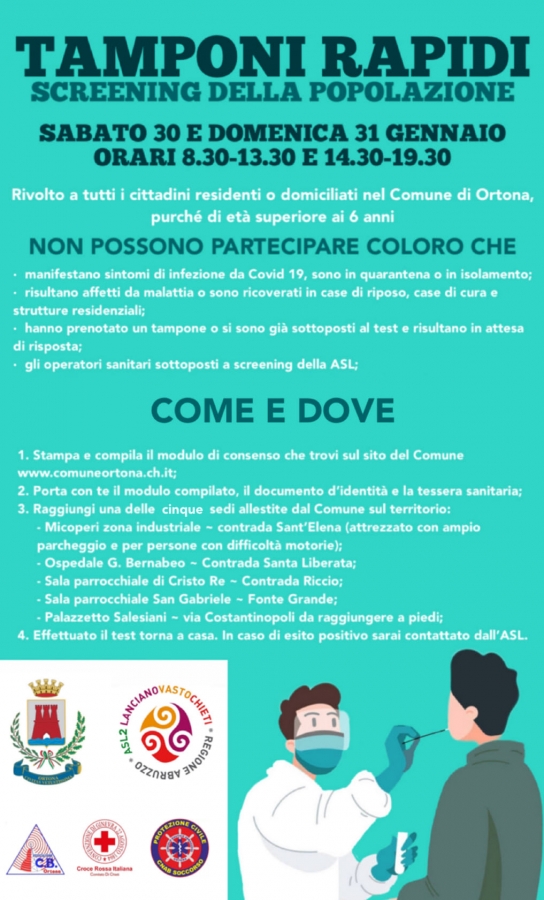 Sabato 30 e domenica 31 Gennaio ci sarà lo screening di massa sulla popolazione ortonese da Sars-Cov-2 mediante il test antigenico rapido.