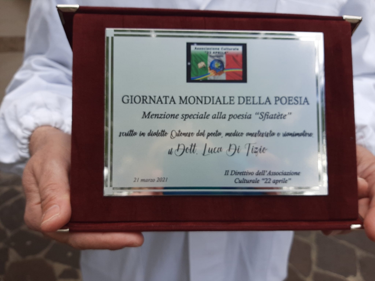 Dopo un anno nel quale il racconto del Covid-19 è passato molto attraverso le immagini, a Chieti la parola si riprende la scena. E lo fa attraverso pochi versi, intensi, struggenti, ma mai leziosi scritti da un anestesista del "SS. Annunziata" che racconta il tumulto emotivo del momento nel quale si appresta a intubare un paziente, tormentato da esitazioni contrastanti: glielo dico oppure no, cosa gli dico, cosa mi risponderà . Il medico è Luca Di Tizio, nostro concittadino, che questa mattina nello spazio antistante l'ospedale ha ricevuto il premio che gli è stato conferito dall'Associazione Culturale 22 aprile, impegnata sui temi della letteratura e dell'ambiente.