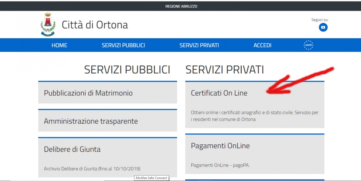 Dopo l'attivazione della convenzione tra il Comune e la Federazione Italiana Tabaccai che estende la possibilità di usufruire dei servizi dell'ufficio anagrafe senza recarsi presso la sede comunale ma nei tabaccai convenzionati, un altro sostanziale passaggio in favore dei cittadini è rappresentato dalla possibilità del rilascio dei certificati anagrafici e di stato civile direttamente da casa attraverso il sito del comune di Ortona.
