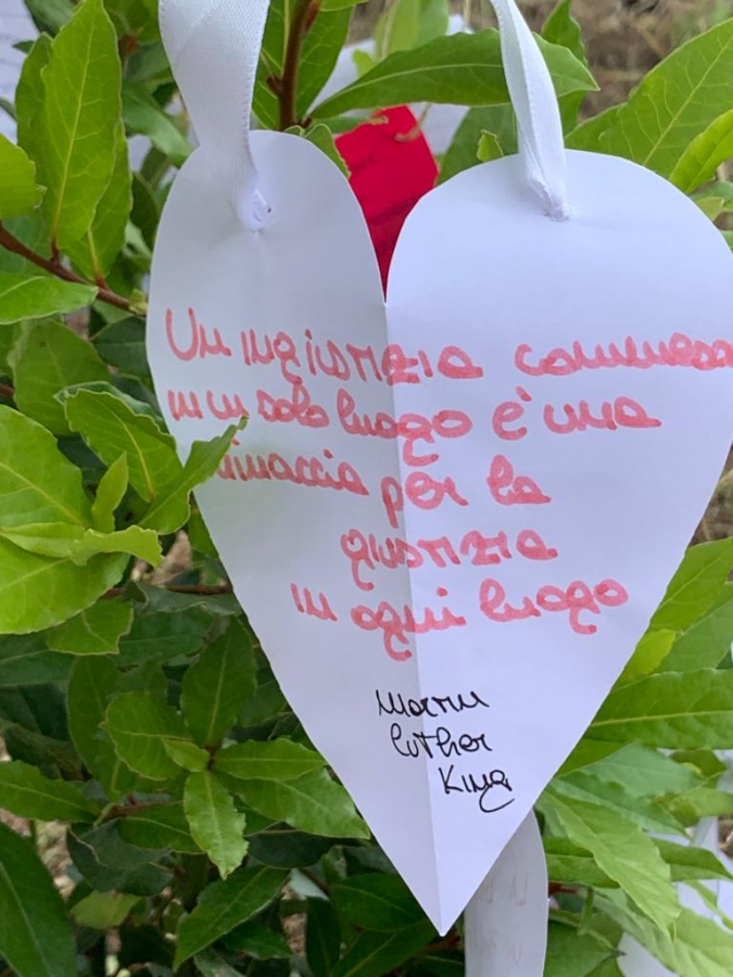 Gli alunni delle classi terze e quarte hanno condiviso pensieri personali e frasi celebri sulla legalità, scritti su foglietti di carta bianca che hanno ornato l’albero appena interrato. L’inno di Mameli ha infine concluso la celebrazione all’aperto.