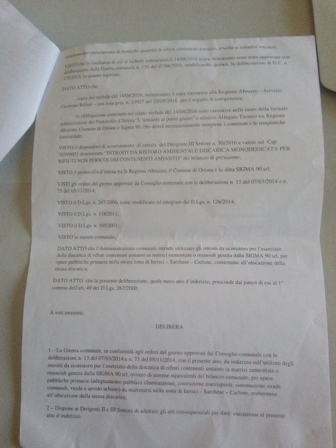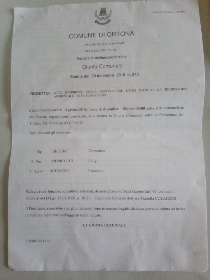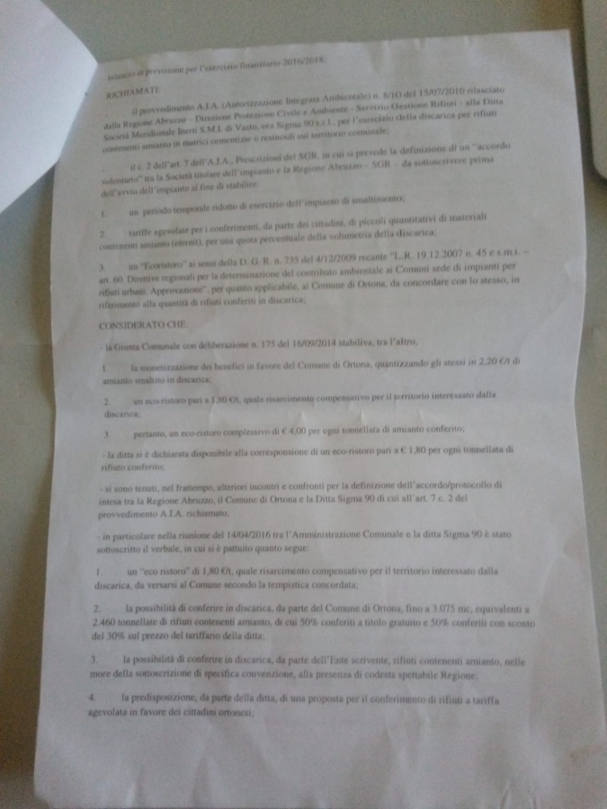“ Ero presente agli incontri, non sono intervenuto nel dibattito - sottolinea De Iure -ma ho avuto l’impressione che i residenti non avevano capito la reale portata dell’incontro” e riassume i ternini del ristoro ambietale “ l’incasso concordato era di 385.000, e si articola in un primo versamento di 185.000 , e poi con versamenti mensili successi, come previsto dell’accordo determinato dall’amministrazione D’Ottavio e con la determinazione della perimetrazione dell’area dove realizzare gli interventi finanziati con queste somme Vedi delibera ..