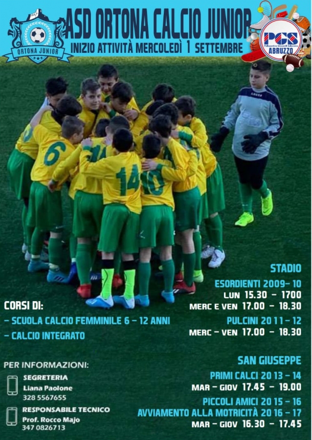 In calendario anche la ripartenza già da mercoledi 1 settembre per le attività di Scuola Calcio per i ragazzi classe 2009 - 2010- 2011 - 2012 - presso lo stadio comunale di Ortona e giovedi 2 settembre per i ragazzi classe 2013 - 2014 - 2015 - 2016 presso il campetto in sintetico di San Giuseppe.