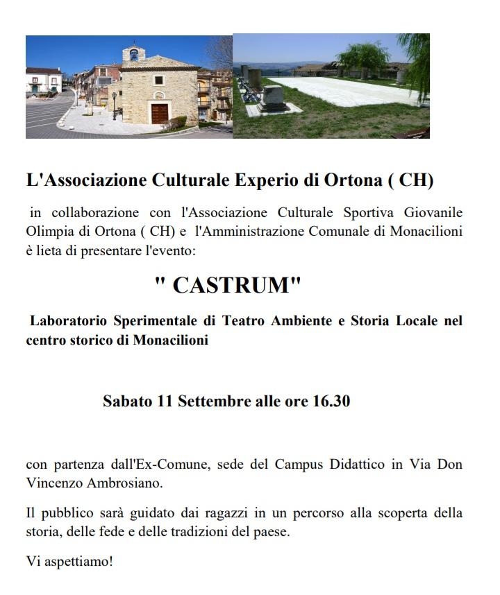 L’associazione Culturale Experio di Ortona , associazione che si occupa della valorizzazione e salvaguardia del patrimonio archeologico attraverso la creatività , l'archeologia sperimentale e i laboratori didattici, presieduta dalla dott. ssa Maria Luisa Orlandi, in collaborazione con l’Associazione Sportiva Giovanile di Ortona e l’amministrazione Comunale di Monacilioni organizza, per sabato 11 settembre alle 16:30, un laboratorio sperimentale di Teatro Ambiente e storia locale nel centro storico di Monacilioni.
