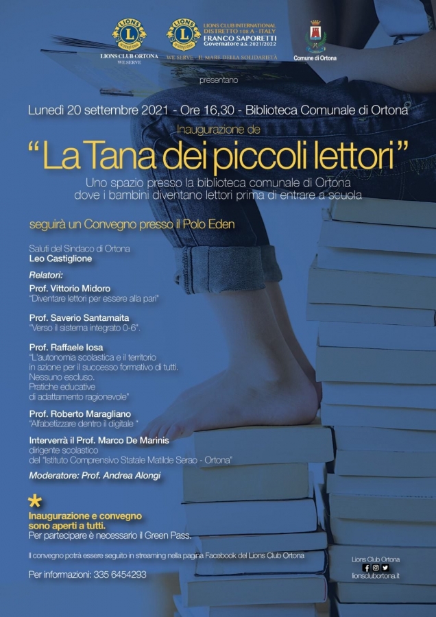Leggere significa scoprire, condividere, emozionarsi, apprendere e socializzare. Tante le declinazioni che la lettura offre. In questo mondo di conoscenza e gioco ad accendere fantasia per l’interesse sono spesso incontri casuali con la lettura. Per favorire un migliore e più coinvolgente incontro tra ragazzi e libri, il Lions club di Ortona promuove per Lunedì 20 settembre alle ore 16.30 nella biblioteca comunale di Ortona l’inaugurazione della: “Tana dei piccoli lettori”.