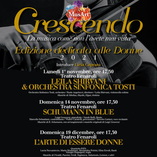 Torna l’atteso appuntamento dell'Associazione Musart con “Crescendo, la musica come non l’avete mai vista”, a Lanciano, nel Teatro Fenaroli. Dopo l'anteprima della stagione ad agosto con il concerto Piccole Onde, il 1° novembre si aprono le porte della terza edizione, che si annuncia di grande interesse per com'è stata formulata, e interamente dedicata alle Donne. Che saranno protagoniste non solo nella musica: ogni concerto sarà preceduto da un'anteprima, un breve spazio nel quale un'ospite si racconterà alla giornalista Licia Caprara.