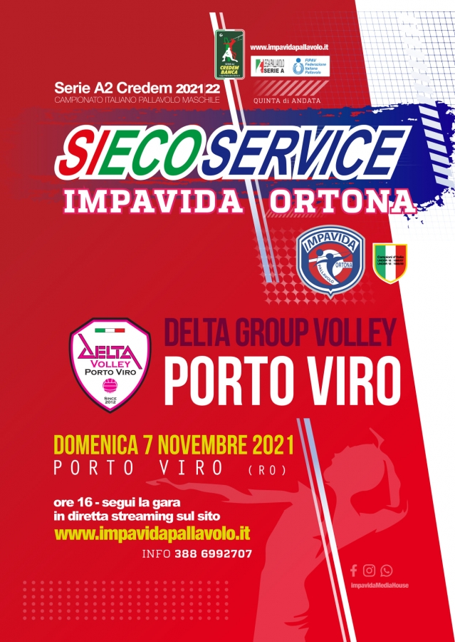 Dopo aver messo in saccoccia il primo punto stagionale, la Sieco Service Impavida Ortona è pronta a mettersi in viaggio per la quinta giornata di andata. Si parte in direzione Porto Viro, in provincia di Rovigo, per sfidare una delle neopromosse dalla Serie A3. Porto Viro, che ha tutta la voglia di mantenere la categoria, in estate ha ingaggiato atleti con grande esperienza in Serie A2 come Bellei, Fabroni, Vedovotto, Mariano e Baroni. La gara avrà inizio alle ore 16.00 e sarà l'anticipo della V giornata di campionato.