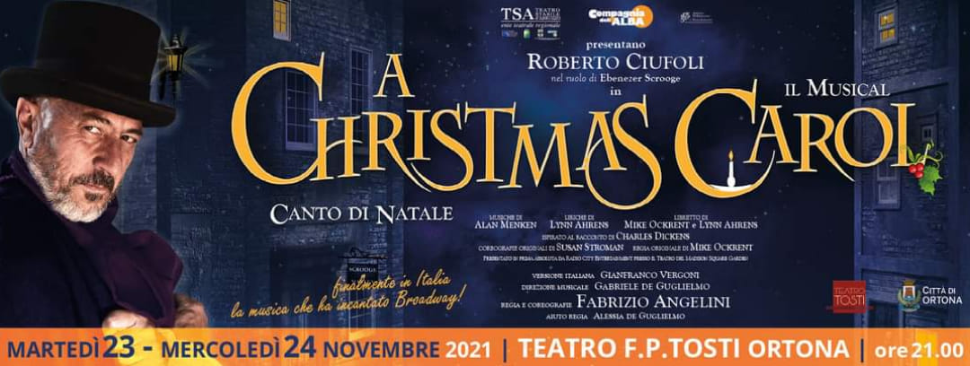 Dopo la pausa forzata, causata dalla pandemia, la Compagnia dell'Alba diretta da Fabrizio Angelini e Gabriele de Guglielmo porta di nuovo il tour il musical A Christmas Carol, in co-produzione con il TSA – Teatro Stabile d'Abruzzo e la collaborazione della Scuola d'Arte New Step di Americo Di Francesco e Paola Lancioni. Il musical riprende la sua tournée con una doppia data al Teatro Tosti di Ortona il 23 e il 24 novembre alle 21.00, e lo fa con un doppio sold out. Un risultato di rilievo ottenuto in pochi giorni di apertura del botteghino, con un Tosti gremito finalmente al 100% che si prepara dunque a riassaporare l'incanto di un romanzo senza tempo che farà emozionare, sorridere e riflettere sul valore della misericordia, intesa come la compassione che fa sentire vicino il nostro prossimo. Tutto questo grazie anche al cast che farà rivivere il classico di Charles Dickens in tutte le sue sfumature. Ancora una volta sarà Roberto Ciufoli, attore e regista teatrale, ad interpretare Ebenezer Scrooge, ricco uomo d'affari dall'indole meschina e avara. Accanto a lui, sul palcoscenico anche i maestri Fabrizio Angelini e Gabriele de Guglielmo, e con loro Carolina Ciampoli, Giancarlo Teodori, Maria Maddalena Adorni, Luca Benini, Mattia Cavallari, Cristian Cesinaro, Valentina Di Deo, Filippo Di Menno, Edilge Di Stefano, Pietro Galetta, Claudia Mancini, Monja Marrone, Serena Mastrosimone, Giulia Rubino, Serena Segoloni, Claudia Vissani. Accanto al cast adulti, un cast di bambini: Alessandro Carulli, Maria Lara Cieri, Luca Civitarese, Mattia Di Nardo, Filippo Di Paolo, Mariele Oliva. Il racconto di Charles Dickens viene proposto nella sua versione teatrale, per la prima volta in Italia con le musiche e le canzoni di Alan Menken (autore di La Bella e la Bestia, La Sirenetta, Aladdin, ecc.), con la regia e le coreografie di Fabrizio Angelini e la direzione musicale di Gabriele de Guglielmo, con Monja Marrone come direzione musicale associata