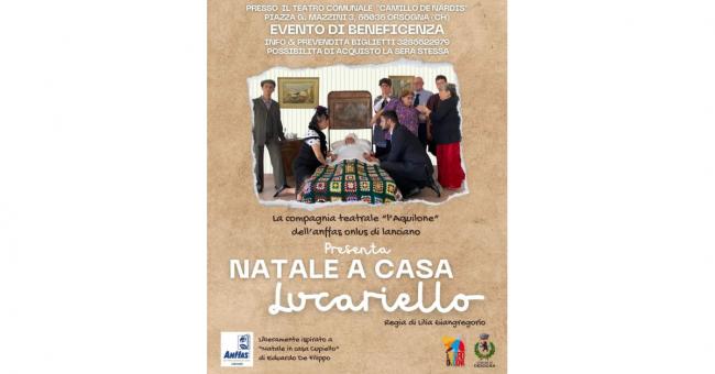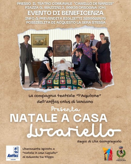 Dopo l’annullamento causa neve nel mese di gennaio, venerdì 3 marzo alle 21.00, i ragazzi e i volontari della compagnia teatrale “L’Aquilone” dell’Anffas Onlus di Lanciano porteranno in scena lo spettacolo "Natale a Casa Lucariello", una rivisitazione in vernacolo lancianese liberamente ispirata all'opera tragicomica di Eduardo De Filippo.