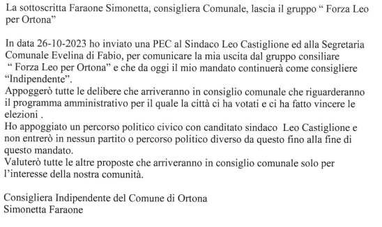La sottoscritta Faraone Simonetta, consigliera Comunale, lascia il gruppo “ Forza Leo per Ortona “