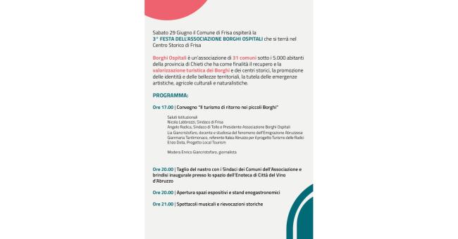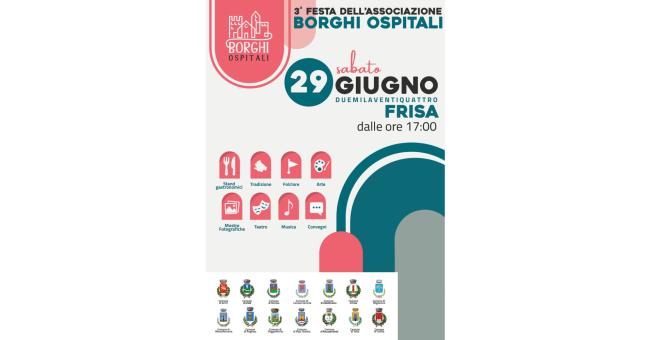- Sabato 29 Giugno dalle ore 17 il Comune Frisa, con il supporto della Proloco Frisa, ospita la 3^ Festa dell’Associazione dei Comuni Borghi Ospitali.