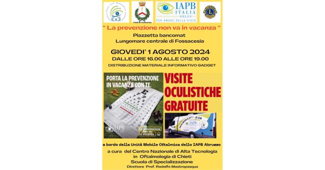 Dopo il grande successo di partecipazione di cittadini e turisti ai primi due appuntamenti di Ortona e Vasto, prosegue il progetto "La prevenzione non va in vacanza”, per salvaguardare la vista anche nel periodo estivo.