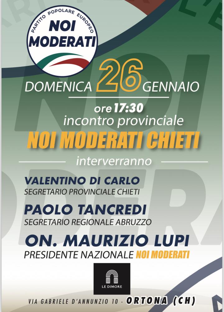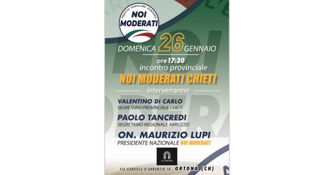 Domenica 26 gennaio alle ore 17.30 , a Ortona presso "Le Dimore" in via Gabriele D'Annunzio 10 , ci sarà un incontro provinciale del partito "Noi Moderati" in cui si evidenzierà il lavoro svolto in questo ultimo anno sul territorio nella prospettiva che attende la compagine di centro destra nelle principali Città interessate dal voto amministrativo.