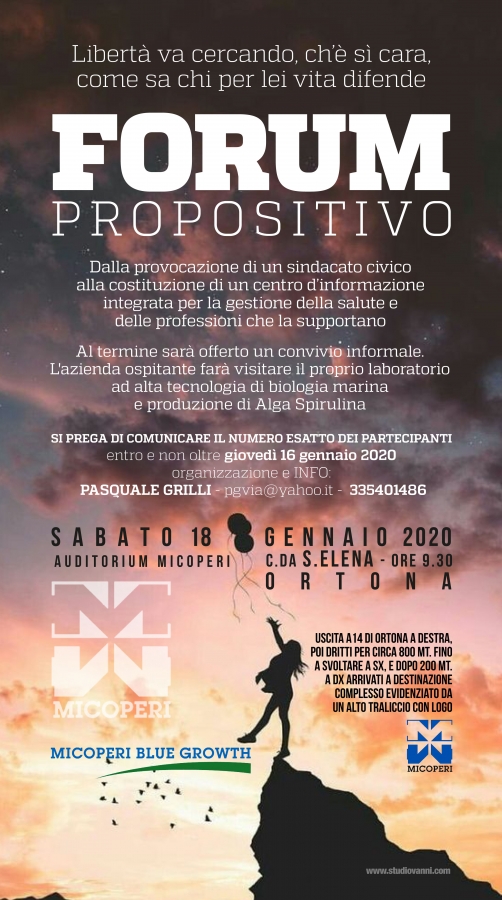 Sabato 18 gennaio alle 9,30 nell’auditorium della Micoperi, a Ortona in contrada S. Elena si terrà un Forum Propositivo su Salute e Salubrità :