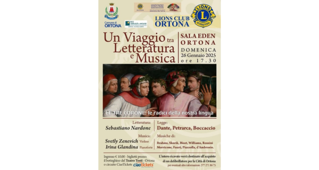Domenica 26 gennaio, alle ore 17.30 presso la Sala Eden di Ortona, l’attore amatissimo Sebastiano Nardone e Svetly Zenevich, che tutti conoscono e apprezzano per la grande professionalità artistica, saranno i protagonisti dell’evento culturale organizzato dal Lions Club di Ortona “Un Viaggio tra Letteratura e Musica”. Tutto finalizzato all’acquisto di un defibrillatore per la città, per cui Nardone leggerà brani dei grandi Dante, Boccaccio e Petrarca e si concluderà con un concerto di altissimo livello musicale. Il duo violino e pianoforte delle straordinarie Svetly Zenevich e Irina Glandina eseguiranno musica classica e contemporanea.