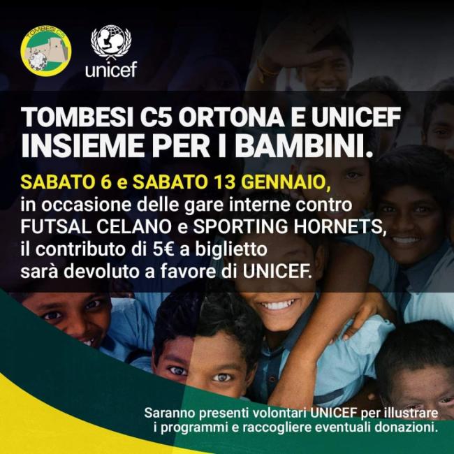 Sabato 6 e sabato 13 gennaio, in occasione delle gare interne contro il Futsal Celano e l' ASD Sporting Hornets Roma, il contributo di 5€ a biglietto sarà devoluto a favore di UNICEF.