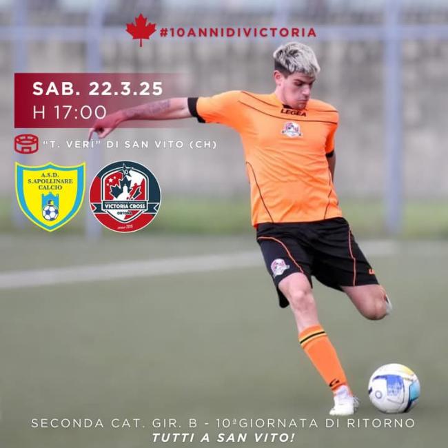 Sabato 22 marzo alle ore 17.00, presso il T. Veri' di San Vito, la Victoria Cross Ortona affronterà il Sant' Apollinare, la gara è valevole per la decima giornata di ritorno del Campionato di Seconda Categoria girone B.